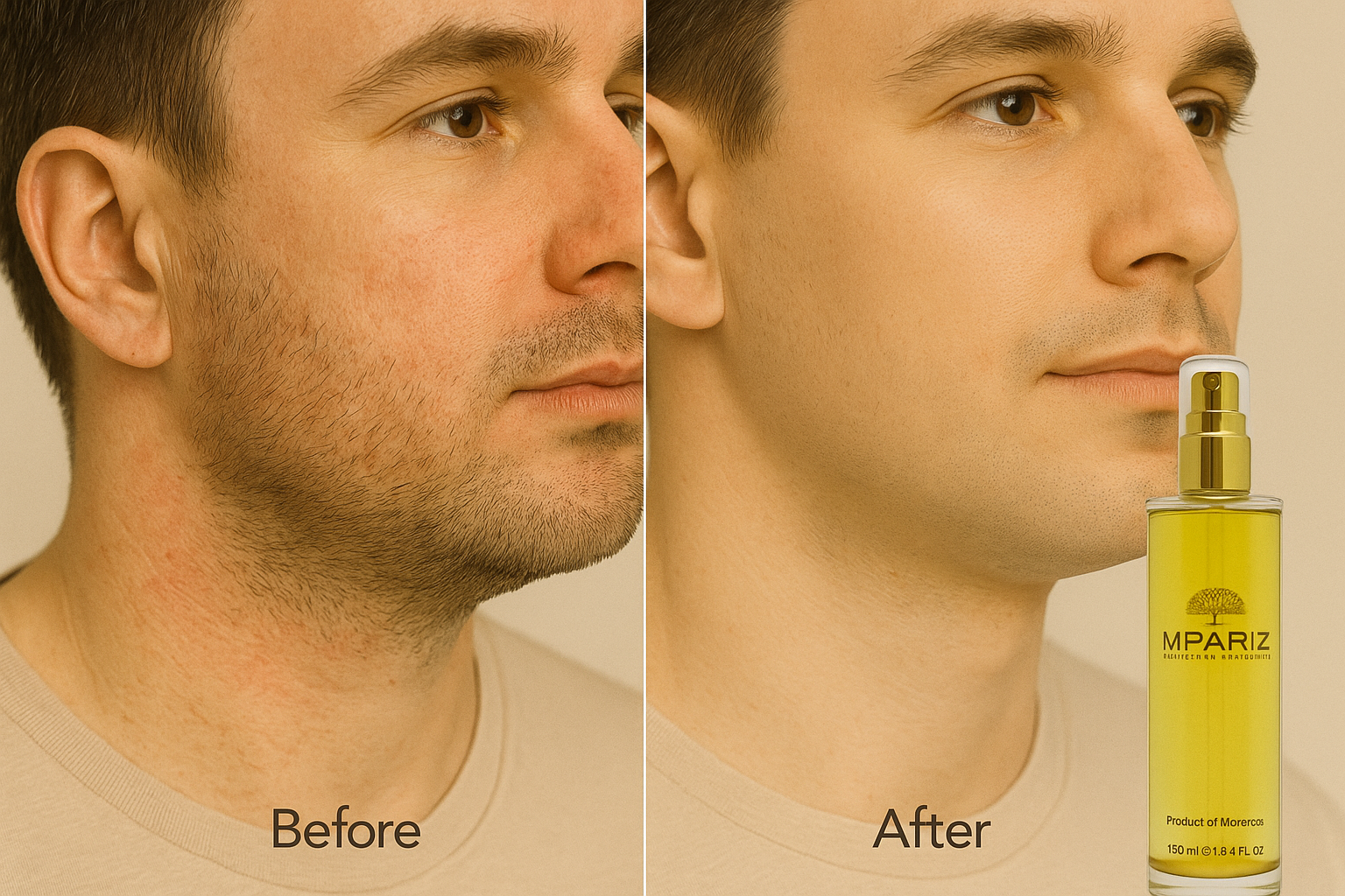 Na iedere scheerbeurt: Spoel je gezicht of geschoren gebied af met koud/lauw water, dep droog. Neem 2-3 druppels arganolie in je handen, wrijf warm en breng zacht aan op de geschoren huid. Niet wrijven of hard inmasseren, gewoon lichtjes verdelen. De olie trekt snel in. Resultaat: geen prikkende aftershave nodig, en binnen minuten voelt je huid comfortabel aan.