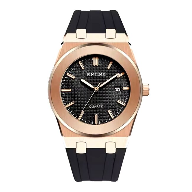 Een horloge dat sportieve kracht en moderne luxe combineert — de Pin Time Rose Black Sport Edition is ontworpen voor de man die houdt van een krachtige uitstraling met verfijnde details. De roségoudkleurige kast vormt een stijlvol contrast met de zwarte, gestructureerde wijzerplaat en de comfortabele rubberen band.