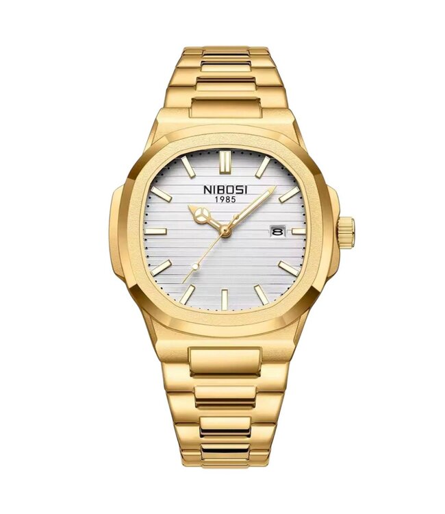 Ervaar de uitstraling van succes met de Nibosi Gold Edition – een horloge dat luxe, kracht en elegantie moeiteloos combineert. De volledig goudkleurige afwerking straalt prestige uit, terwijl de zilverwitte wijzerplaat met horizontale structuur zorgt voor balans en verfijning.