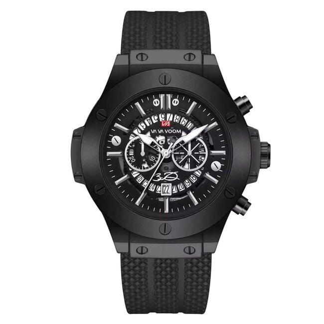 Een horloge dat compromisloze kracht en technische finesse uitstraalt — de Va Va Voom Black Chronograph Edition is ontworpen voor de man die bewust kiest voor een uitgesproken stijl. De volledig zwarte kast en band, gecombineerd met een gedetailleerde en gelaagde wijzerplaat, zorgen voor een dominante en moderne uitstraling.