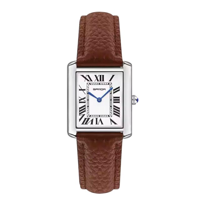 Een horloge dat tijdloze elegantie uitstraalt — de Sanda Classic Rectangular Leather Edition is een ode aan klassieke horlogevormgeving. De rechthoekige zilverkleurige kast, gecombineerd met een helder witte wijzerplaat en Romeinse cijfers, zorgt voor een verfijnde en stijlvolle uitstraling die nooit uit de mode raakt.