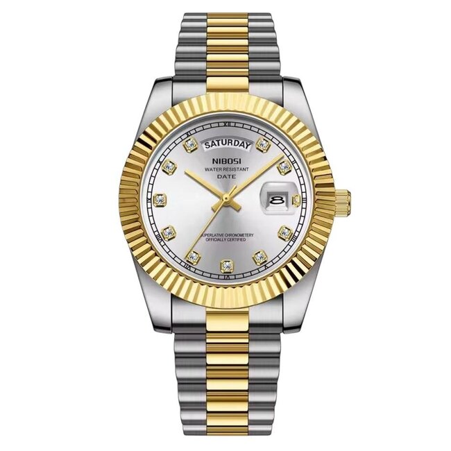 Ontdek de perfecte balans tussen elegantie en prestige met de Nibosi Gold Silver Edition. De bicolor stalen kast en band combineren zilver met goud, wat het horloge een luxueuze uitstraling geeft die direct in het oog springt.