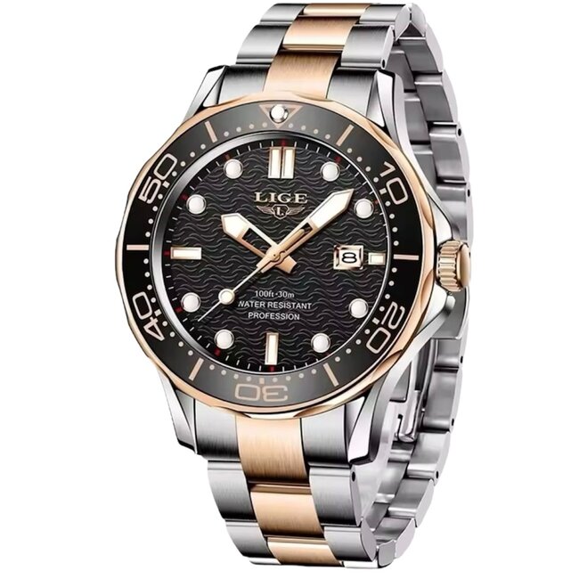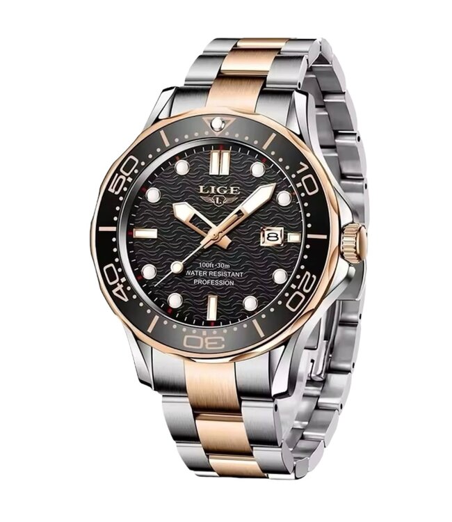 Een horloge dat sportieve prestaties en luxe details samenbrengt — de Lige Two-Tone Black Diver Edition combineert een roestvrijstalen kast en band met goudkleurige accenten en een diepzwarte wijzerplaat met subtiele golfstructuur. Deze bi-color uitvoering geeft het horloge een krachtige, hoogwaardige uitstraling die direct opvalt.